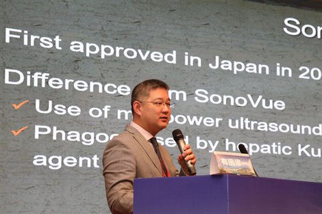来自东京大学的有田淳一教授在华中科技大学附属同济医院汤乔颖医师翻译帮助下,介绍了一种新型造影剂——Sonazoid(示卓安)的物理特性及其在肝细胞癌的术中超声造影、结直肠癌肝转移的术中超声造影、解剖性肝切除等多方面的应用,并分享了有田教授团队做的一项关于示卓安在肝细胞癌术中超声中应用的研究。