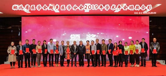 学术讲座结束之后,湖北省医学会超声医学分会副主任委员、武汉大学人民医院的郭瑞强教授主持闭幕式。闭幕式上,现场宣布20名中青年优秀论文获奖者,邓又斌教授、郭瑞强教授、马小静教授、周军教授为其颁发获奖证书,并合影。